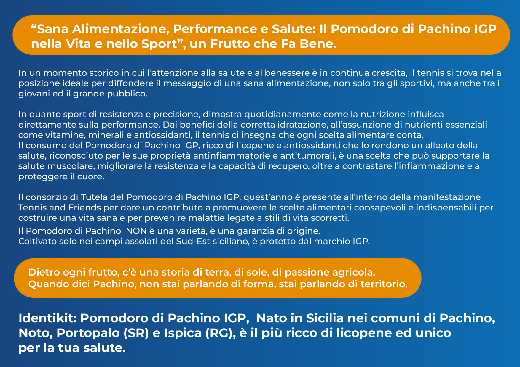 Sabato 11 e domenica 12 ottobre, dalle 12.30 alle 15.00, nell’area ospitalità saranno offerte degustazioni no stop a base di pomodoro di Pachino IGP. Inoltre, alle ore 16.00 di domenica 12 ottobre, si terrà il panel informativo “1000 virtù del pomodoro di Pachino IGP”, al quale parteciperanno il Presidente del Consorzio, Sebastiano Fortunato, il Direttore ICQRF di Campania e Molise Salvatore Schiavone (autore del volume “A tavola con l’arte culinaria al teatro e al cinema”), la ginnasta CONI Valentina Abruzzeso, la nutrizionista sportiva Francesca Grasso, l’esperto di marketing strategico ed ESG Vincenzo La Croce (che parlerà di sostenibilità ambientale, sociale e di qualità per le imprese) e il Presidente di Longaevitas APS (associazione che promuove l’educazione alimentare nelle scuole), Salvatore Latino. A concludere l’incontro saranno Alessandro Cochi, Presidente Coni Lazio, e Giorgio Meneschincheri, Presidente e fondatore di Tennis and Friends.